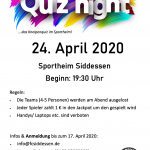 — Am Freitag, den 24.04.2020 um 19:30 Uhr heißt es im Sportheim Siddessen zum ersten Mal: Vorhang auf zur Quiz night. Bei diesem Kneipenquiz wird in Teams mit 4-5 ...